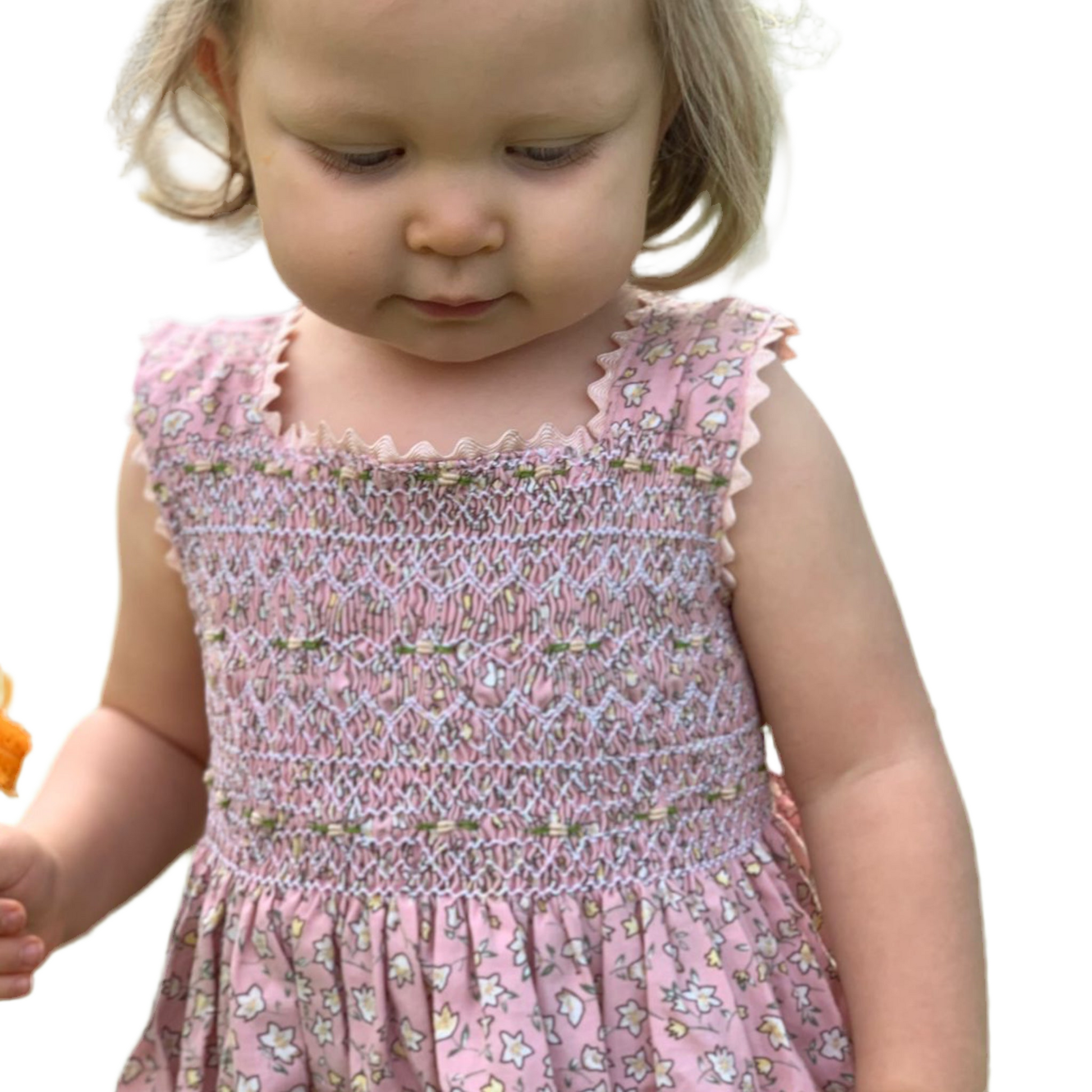Vestido en tonos rosa pastel con bordado de smock y espiguilla.